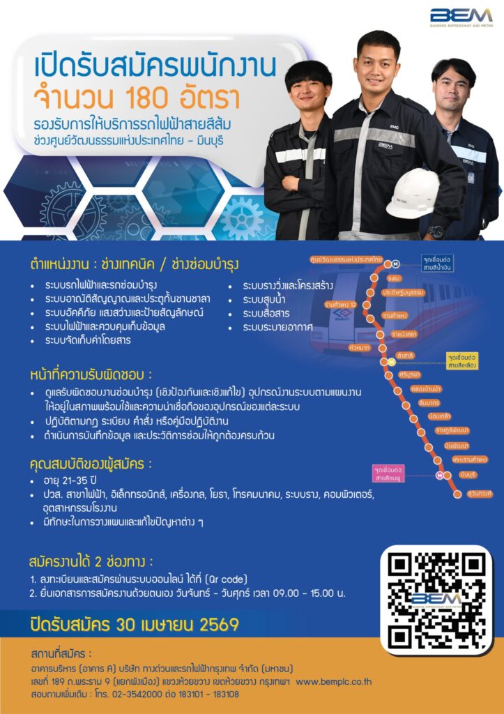 บริษัท ทางด่วนและรถไฟฟ้ากรุงเทพ จำกัด (มหาชน) BEM เปิดรับสมัครพนักงาน 180 อัตรา รับสมัครทางอินเทอร์เน็ต – 30 เมษายน 2569