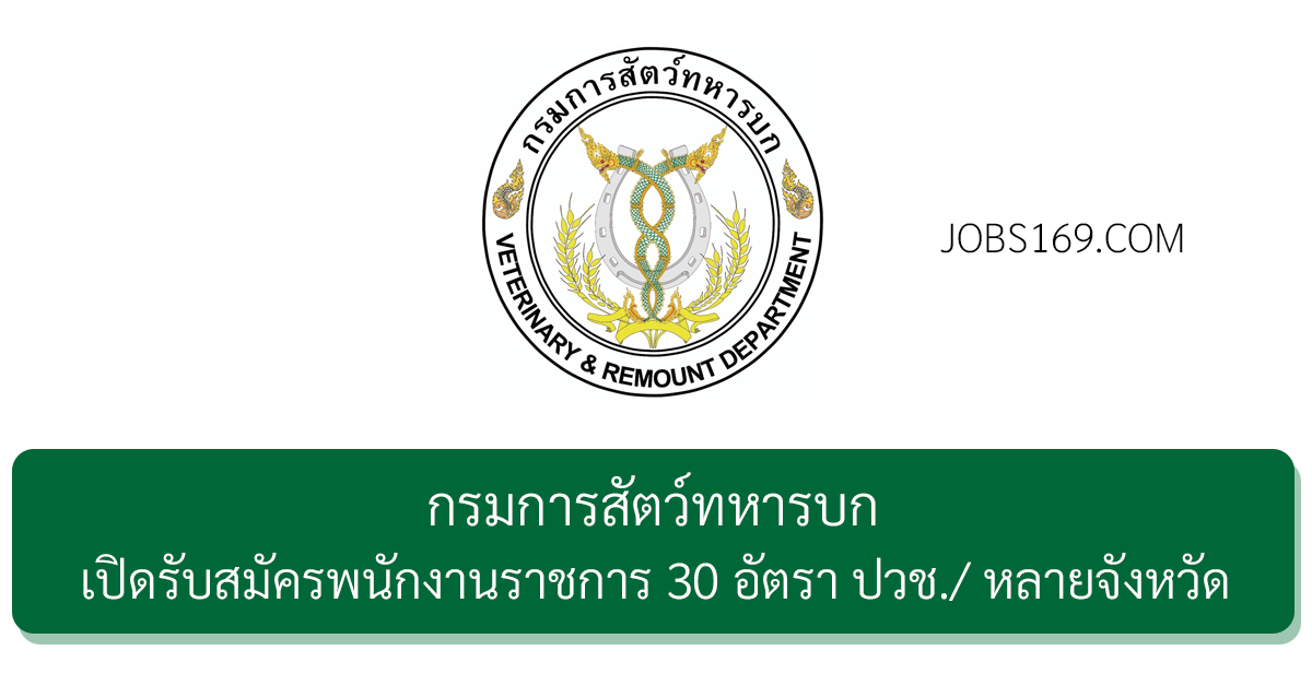 กรมการสัตว์ทหารบก เปิดรับสมัครพนักงานราชการ 30 อัตรา ปวช./ หลายจังหวัด รับสมัครด้วยตนเอง 20 – 24 เมษายน 2569